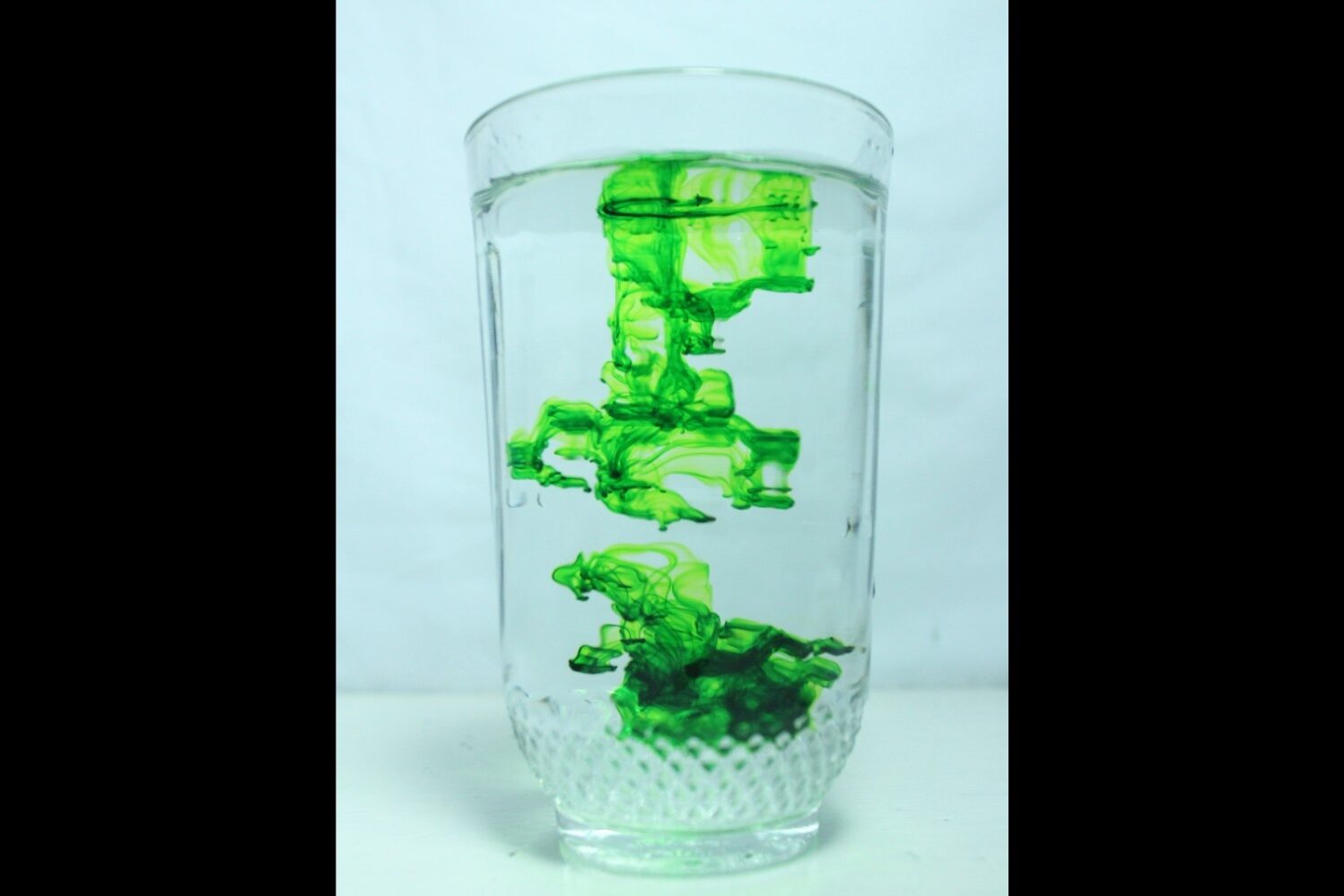 “Pewarna hijau yang baru saja diteteskan menyebar dengan pola abstrak di dalam air, menciptakan bentuk- bentuk yang unik dan terhenti sempurna.” Kalacitra/ Siti Khairani