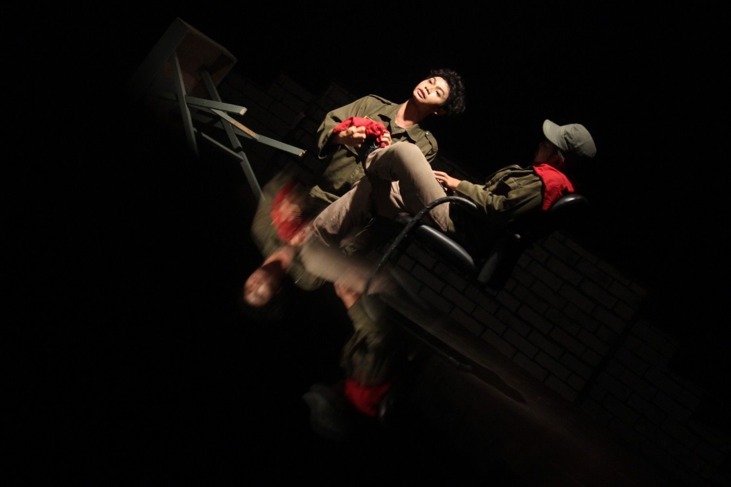 “Dua mahasiswa UIN Syarif Hidayatullah Jakarta memerankan Kapten dan Woyzeck pada pementasan Kopral Woyzeck karya Georg Büchner oleh Teater Syahid di Hall Student Center, Minggu (19/10/25).” Kalacitra/ Ilyas Khairil