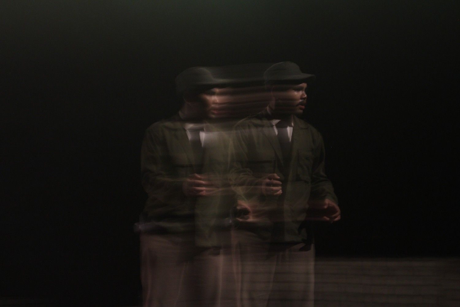 “Seorang mahasiswa UIN Syarif Hidayatullah Jakarta memerankan Kapten, sosok berkuasa yang menekan Woyzeck dalam pementasan Kopral Woyzeck karya Georg Büchner oleh Teater Syahid di Hall Student Center, Minggu (19/10/25).” Kalacitra/ Ilyas Khairil