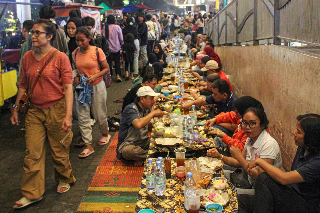 “Sejumlah warga menikmati momen berbuka puasa bersama di kawasan Blok M, Jakarta Selatan, Jumat (7/3/2025). Kalacitra/ Sofwah Maulidi
