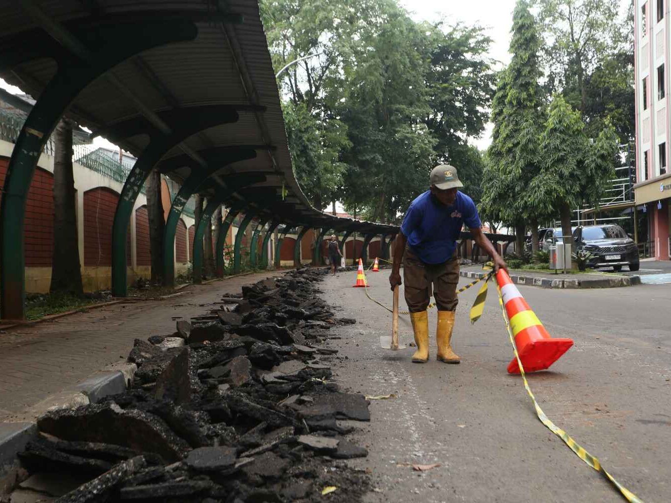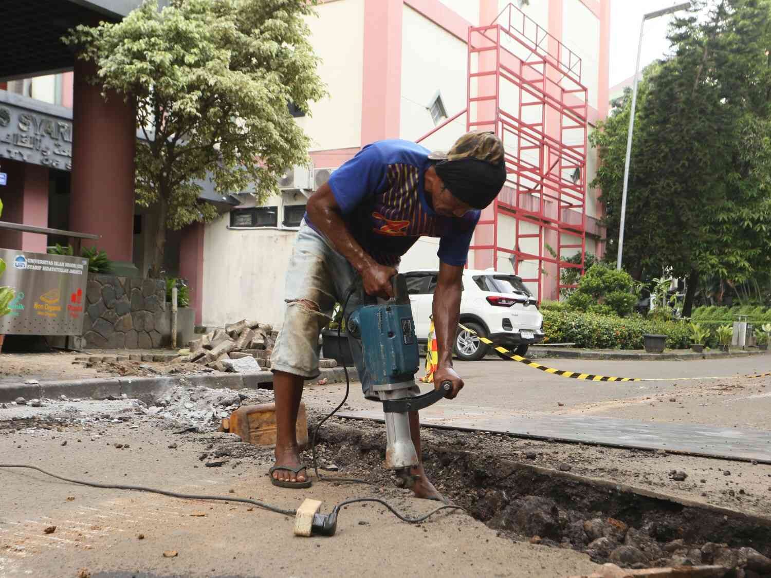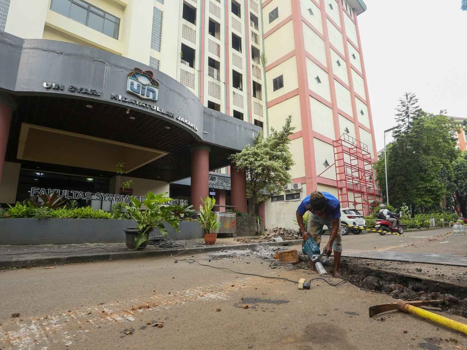 Revtalisasi trotoar UIN Syarif Hidayatullah Jakarta, Ciputat, Tangerang Selatan, Selasa (3/2/2026). Revitalisasi dimulai sejak akhir Januari perkiraan selesai pengerjaan bulan Mei, perbaikan ini gunanya memperlebar trotoarbagi pejalan kaki dan penambahan saluran air.