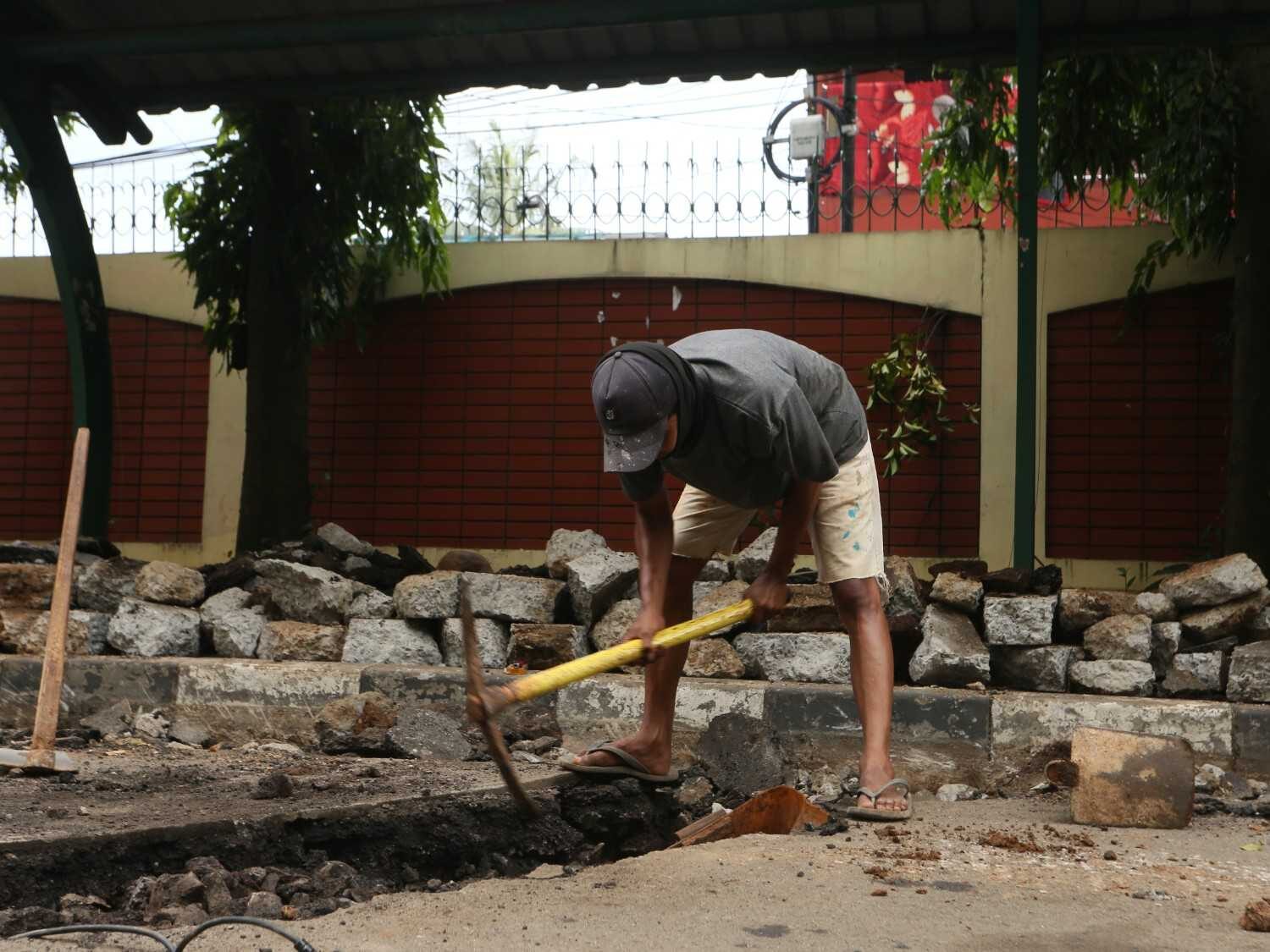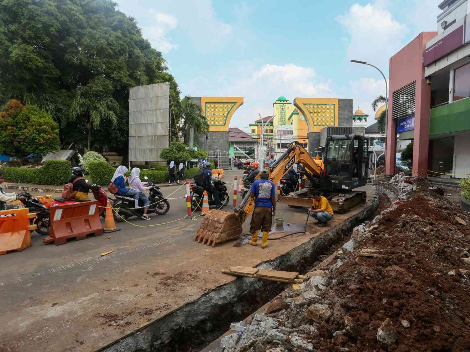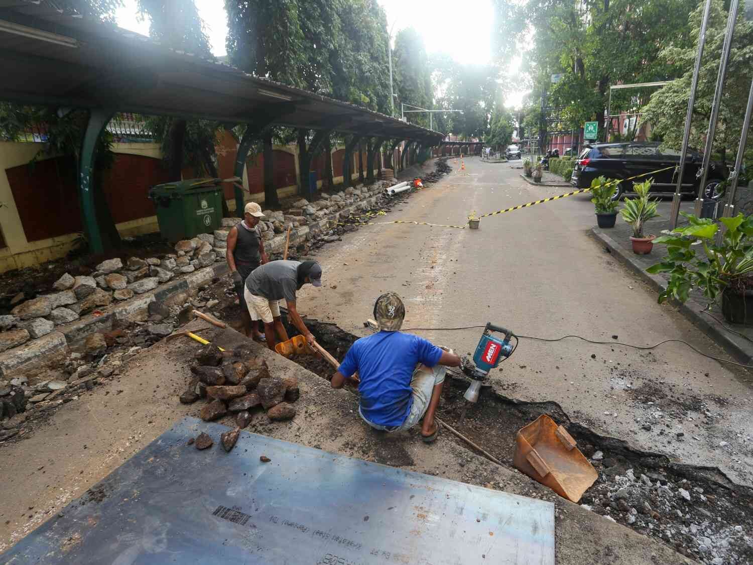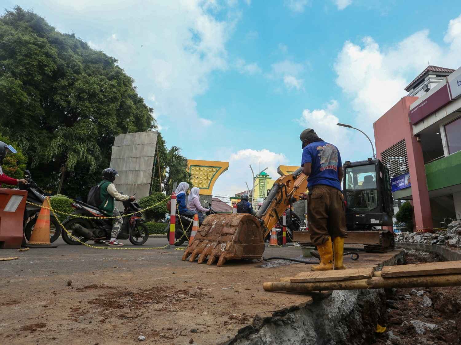 Revtalisasi trotoar UIN Syarif Hidayatullah Jakarta, Ciputat, Tangerang Selatan, Selasa (3/2/2026). Revitalisasi dimulai sejak akhir Januari perkiraan selesai pengerjaan bulan Mei, perbaikan ini gunanya memperlebar trotoarbagi pejalan kaki dan penambahan saluran air.